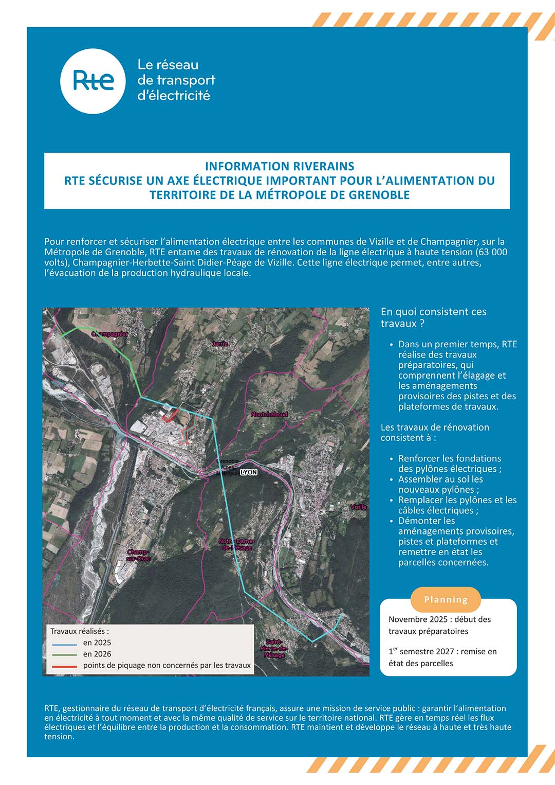 Nous vous informons que les travaux préparatoires sur la ligne électrique, pour les communes de Vizille, Saint Pierre de Mésage, Notre Dame de Mésage, Montchaboud et Jarrie, démarreront en novembre 2025.